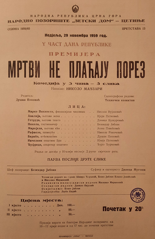 Napisao: Nikolo Manzari. Scenaristkinja: Danica Mugoša. Tehnički radovi na sceni: Špiro Ćeranić, Božidar Jablan, Milenko Miranović i Blažo Jovićević. Šef pozornice: Božidar Jablan. Sufler: Danica Mugoša. Rekvizita i vlasuljarski radovi: Milenko Miranović. Stolarski radovi: Danilo Pajević. Osvjetljenje: Božidar Jablan. Garderoba: Ljubo Kadić.